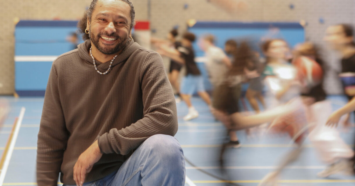 ‘In mijn lessen staat die zoektocht centraal. Bij Nederlands laat ik leerlingen bijvoorbeeld schrijven over hun dromen of hoe ze in het leven staan. De sportles begin ik regelmatig met een moment van meditatie. Even stilstaan bij wie je bent en wat je voelt. Uit het hoofd en in het lichaam.’ Voor corona maakte Jordy in de pauzes regelmatig muziek met leerlingen en werd er gerapt in de studio. ‘Als je dicht bij jezelf blijft en ruimte in je hoofd hebt, kun je ook meer ruimte maken voor anderen en ben je beter in staat kennis op te doen op school. Dat zie ik keer op keer.’
